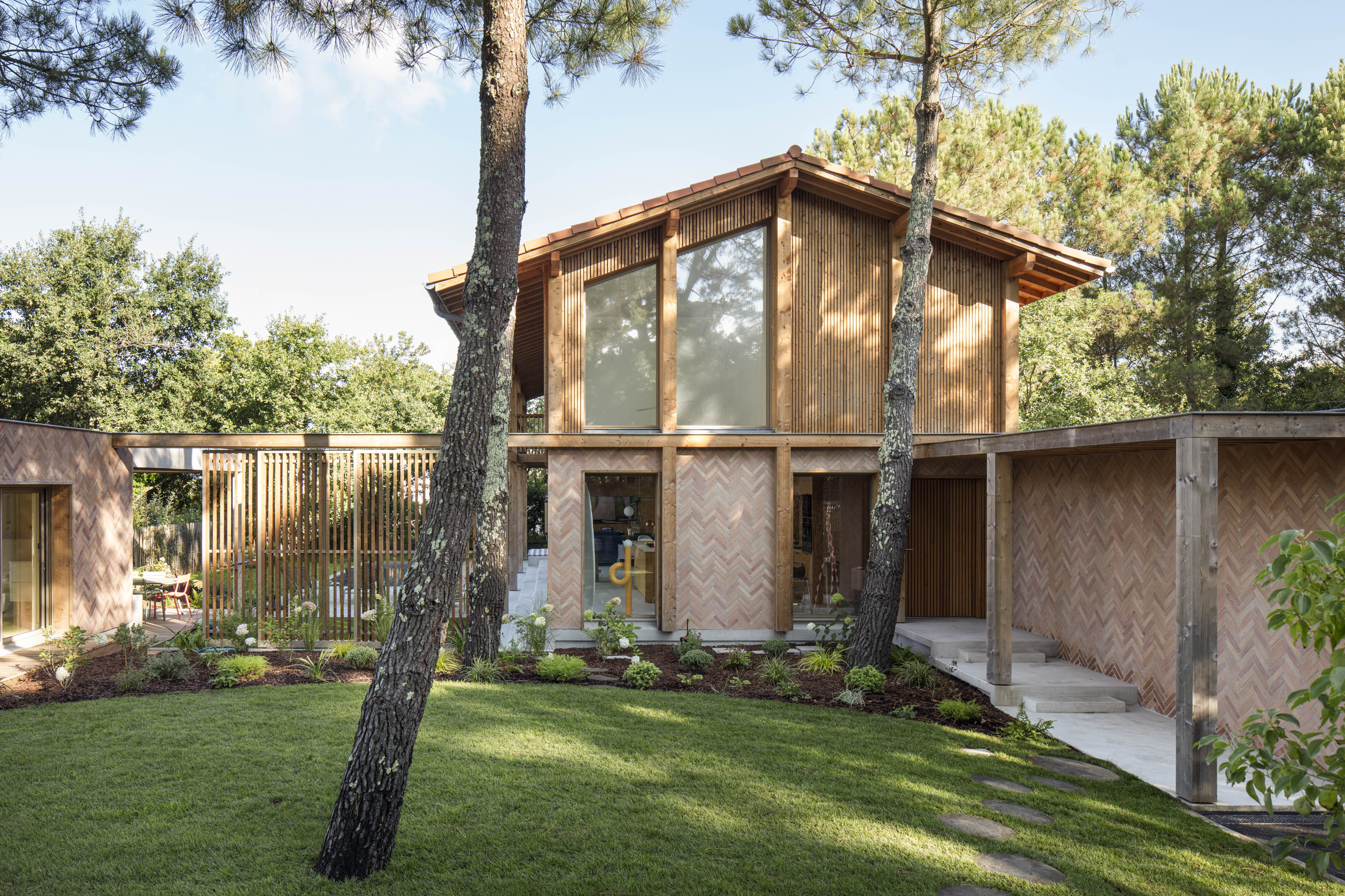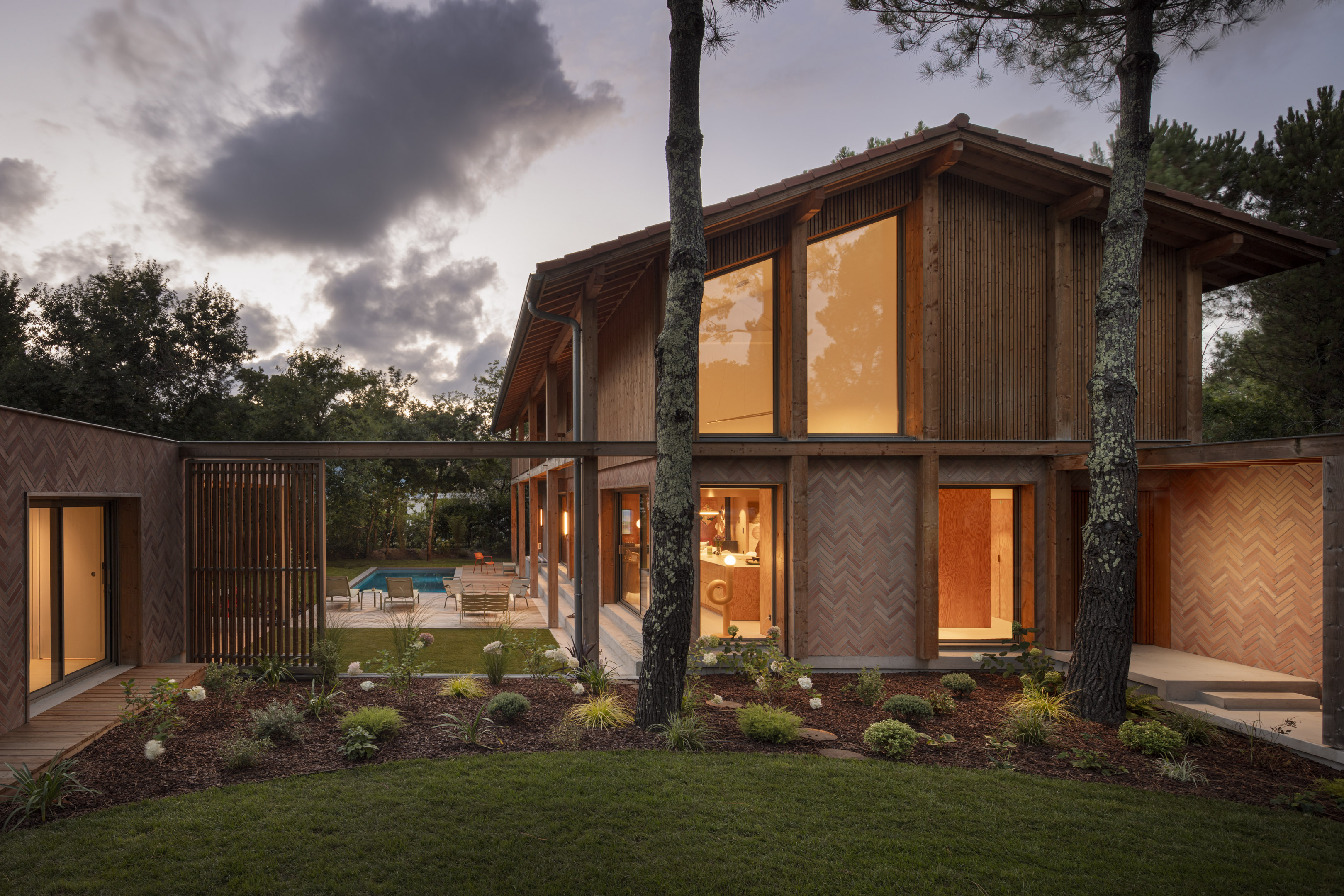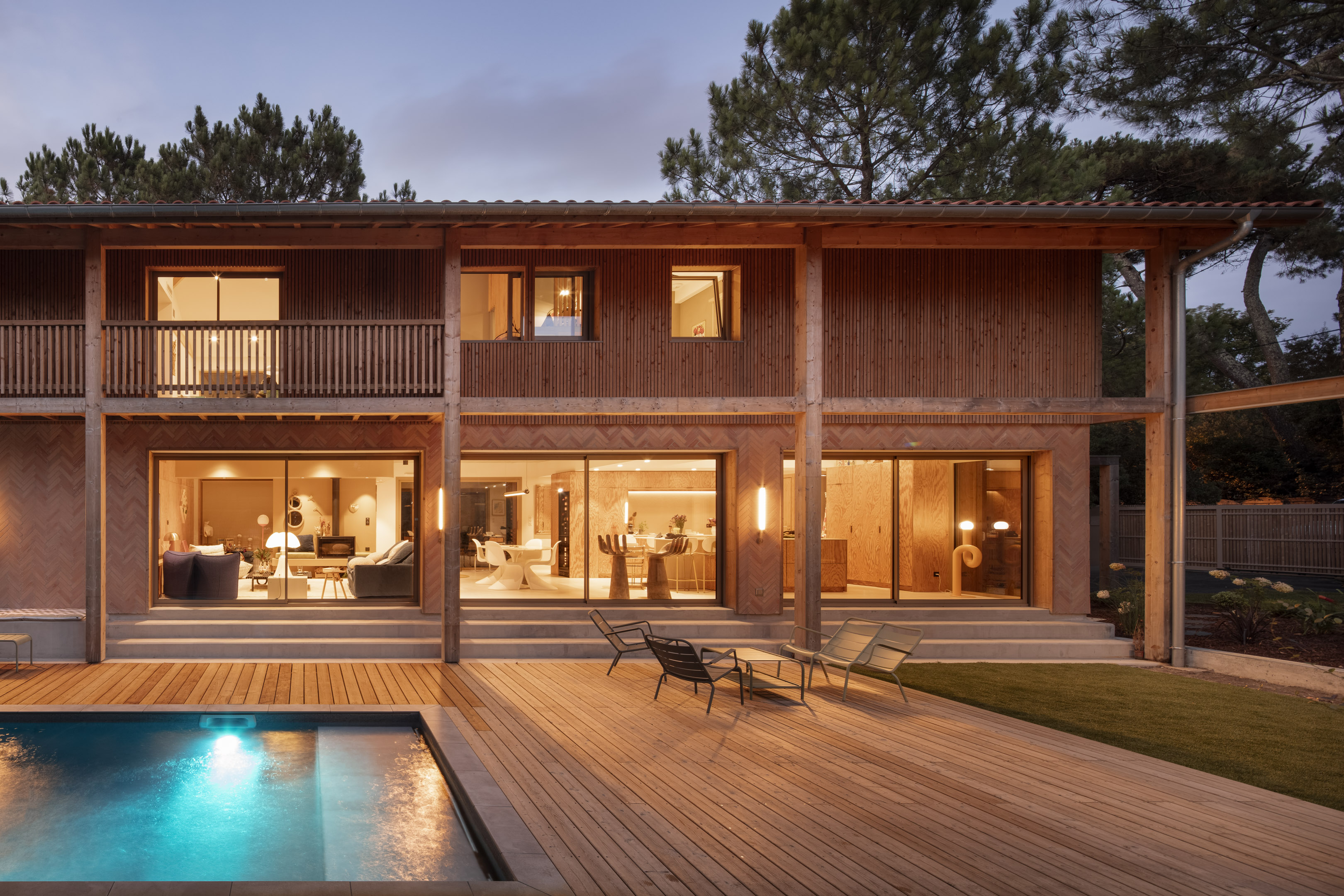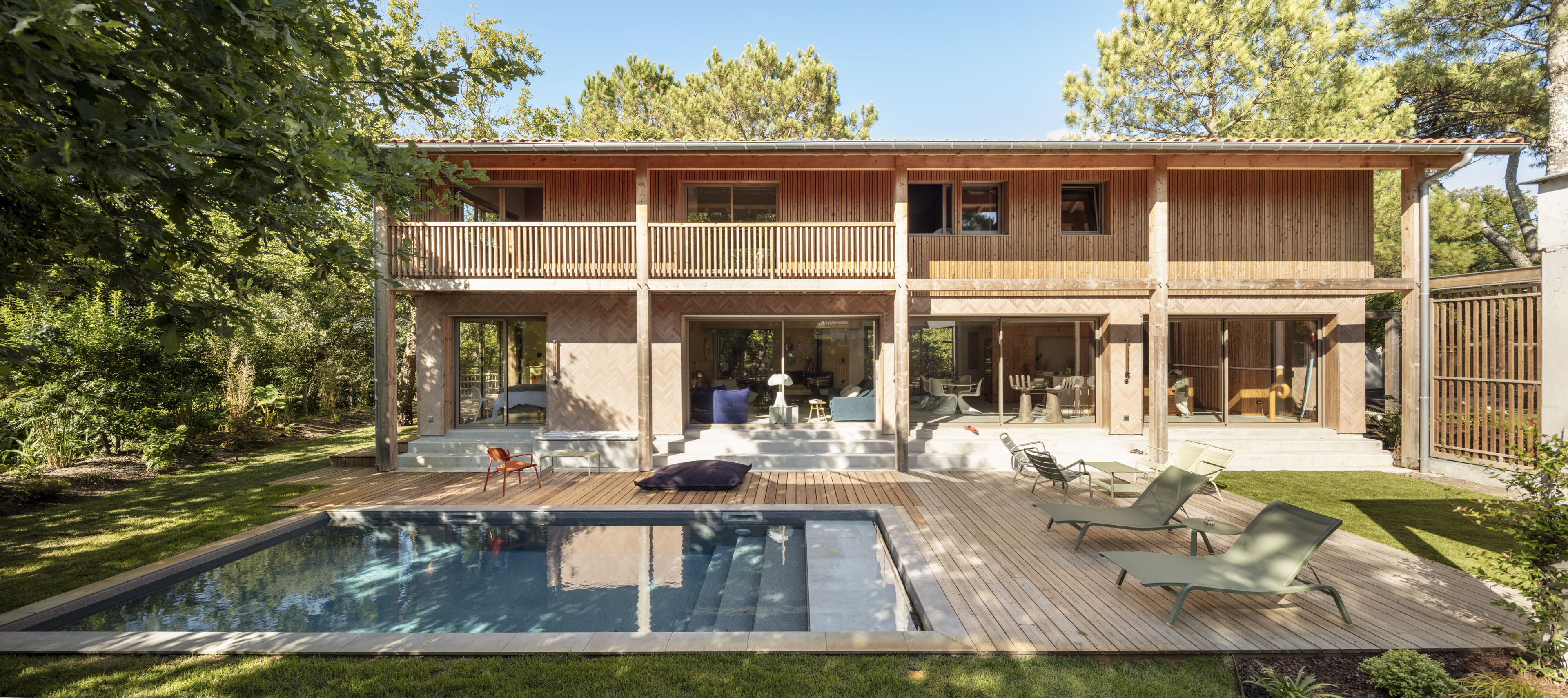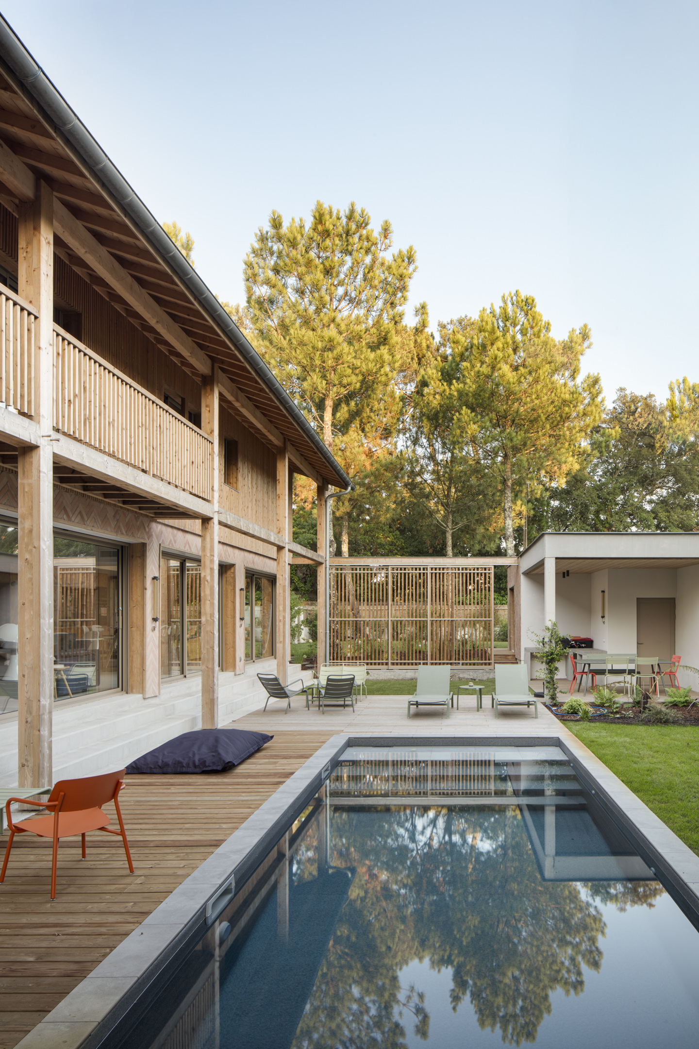 Cette villa puise son inspiration dans l’architecture landaise qu’elle se réapproprie et réinterprète de manière contemporaine.