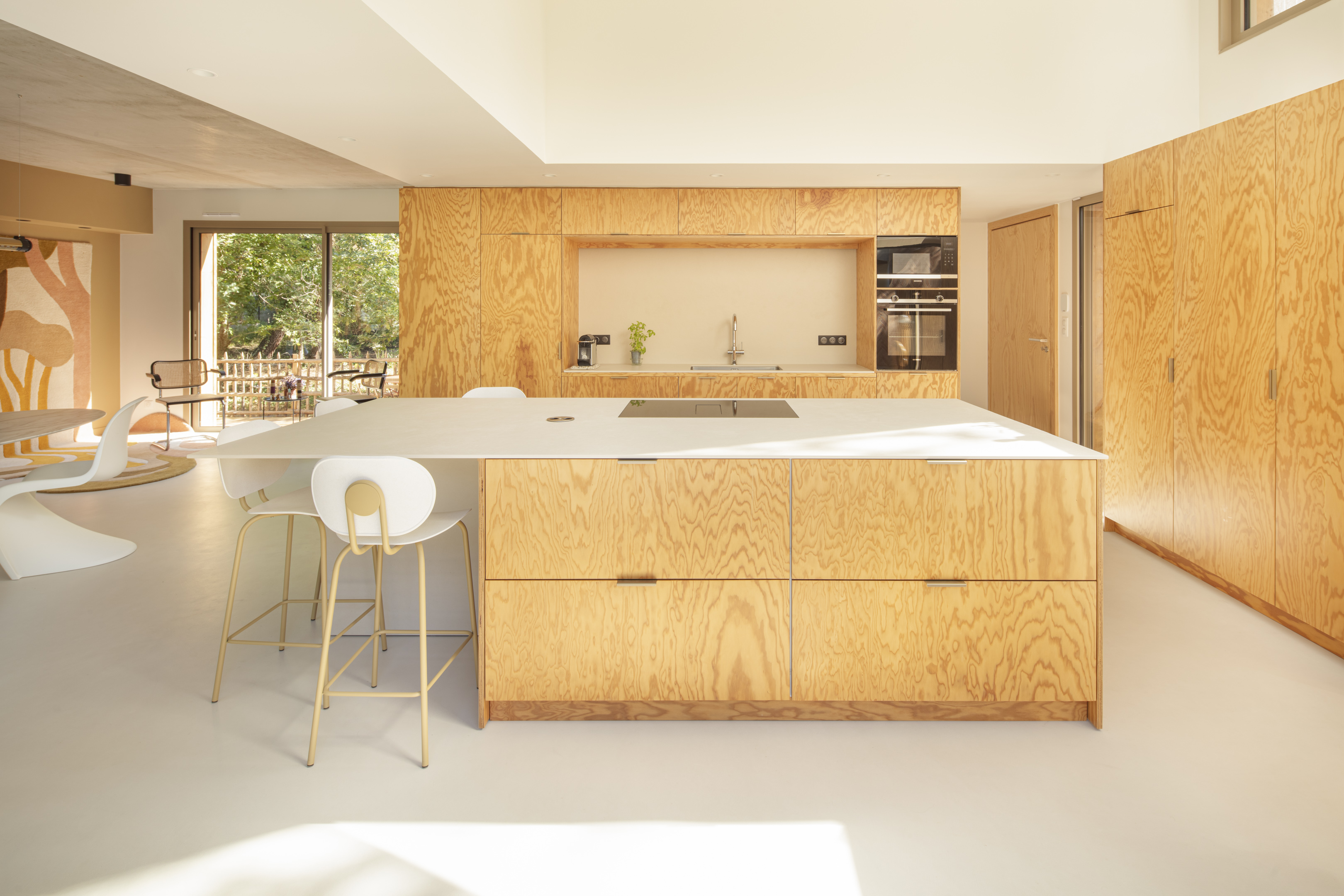 Les agencements intérieurs réalisés avec du contreplaqué en pin maritime issu des forêts landaises contrastent avec les sols et plafonds en béton : une esthétique soignée et forte s’en dégage.