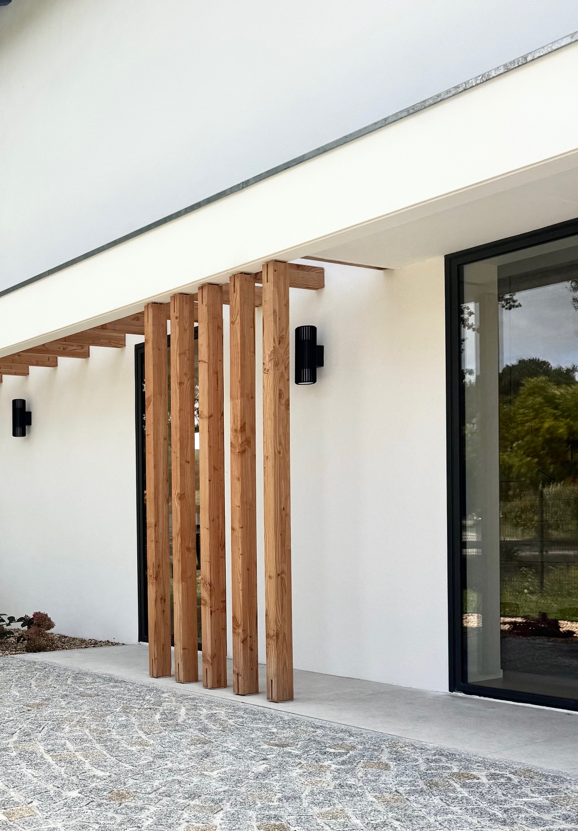 La maison se développe sur deux niveaux et s’organise autour de la piscine et de la terrasse, avec deux ailes en simple rez-de-chaussée qui structurent les espaces extérieurs.