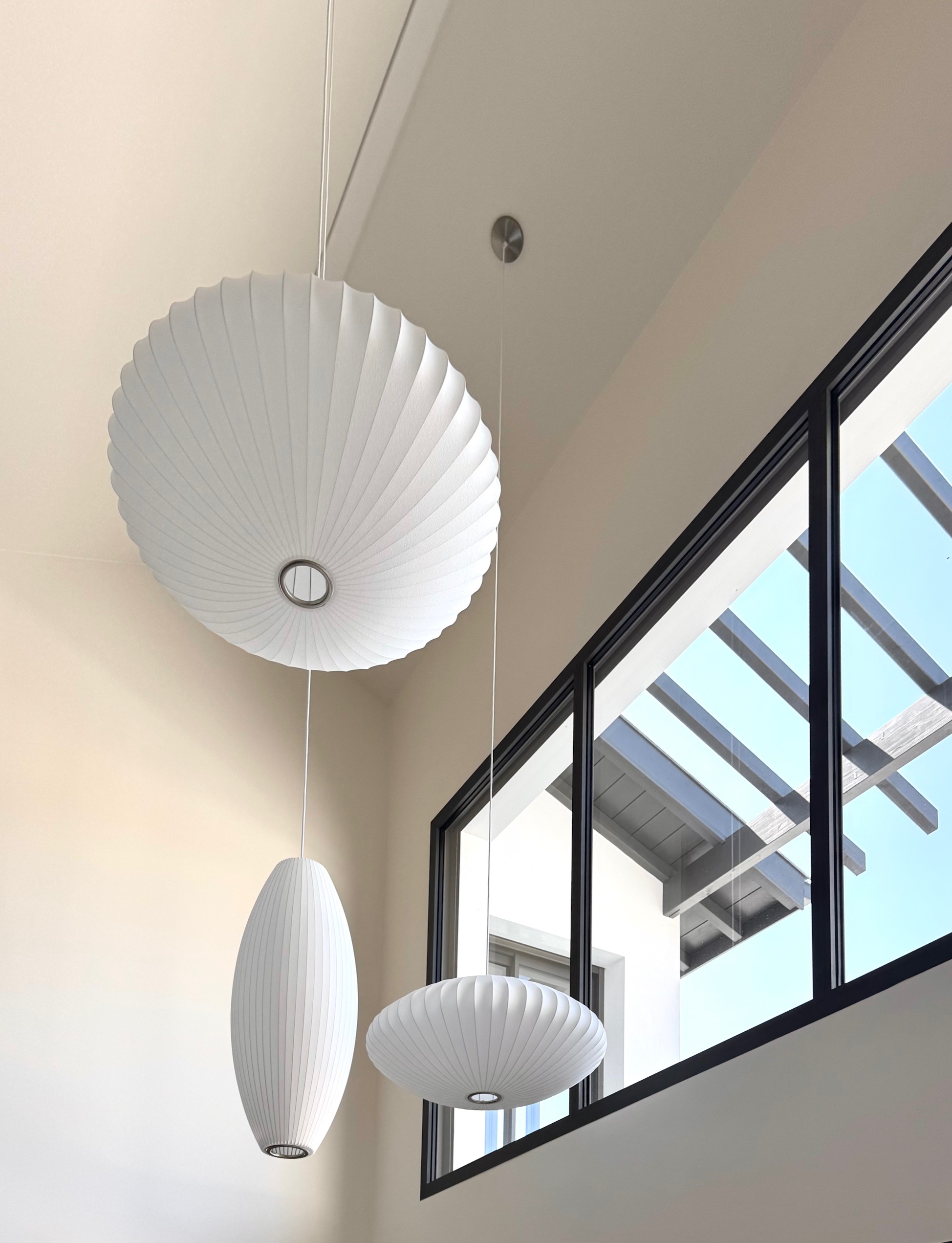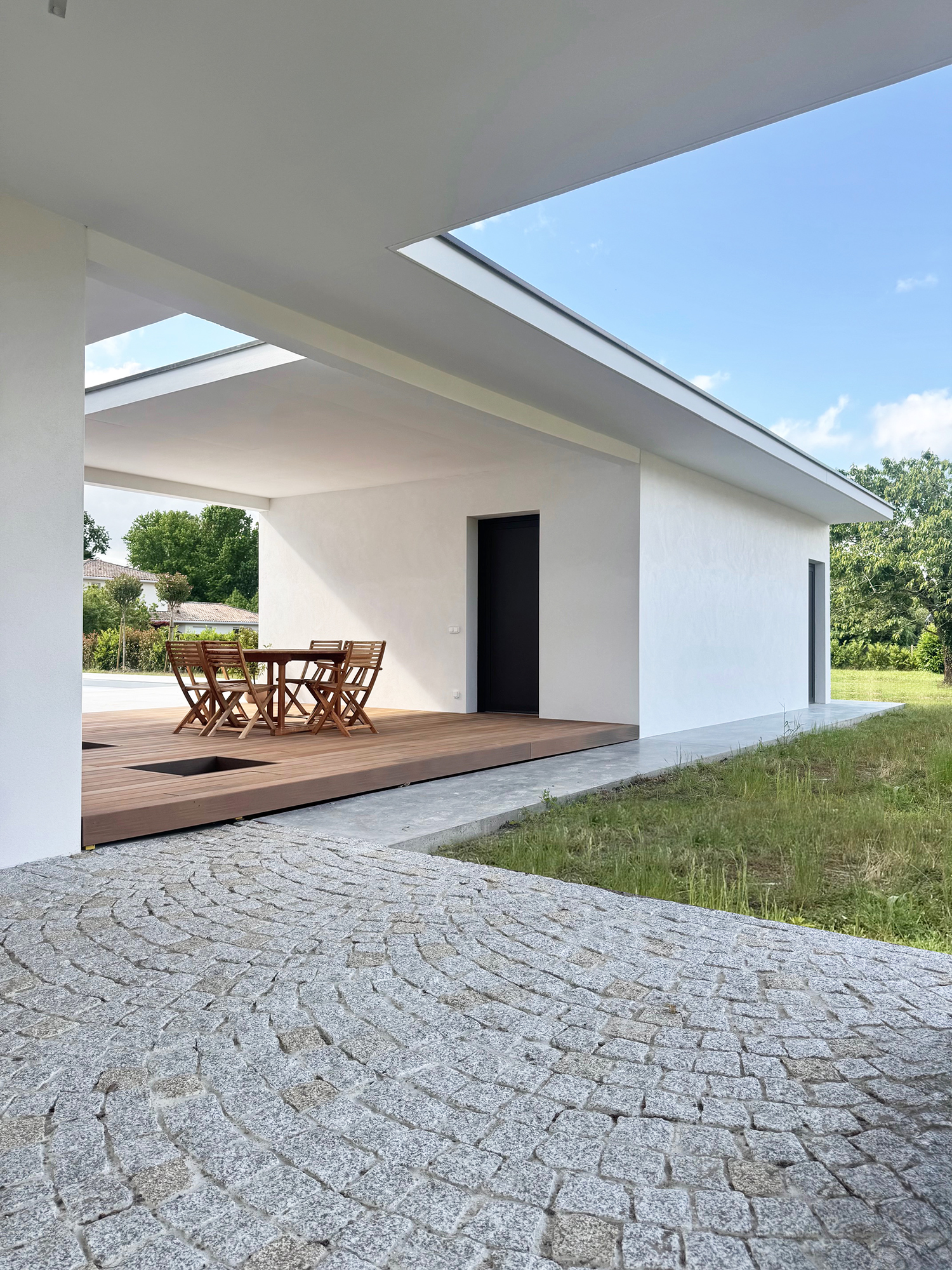 Un escalier suspendu en chêne assure la liaison avec l’étage et devient un élément central de la maison.