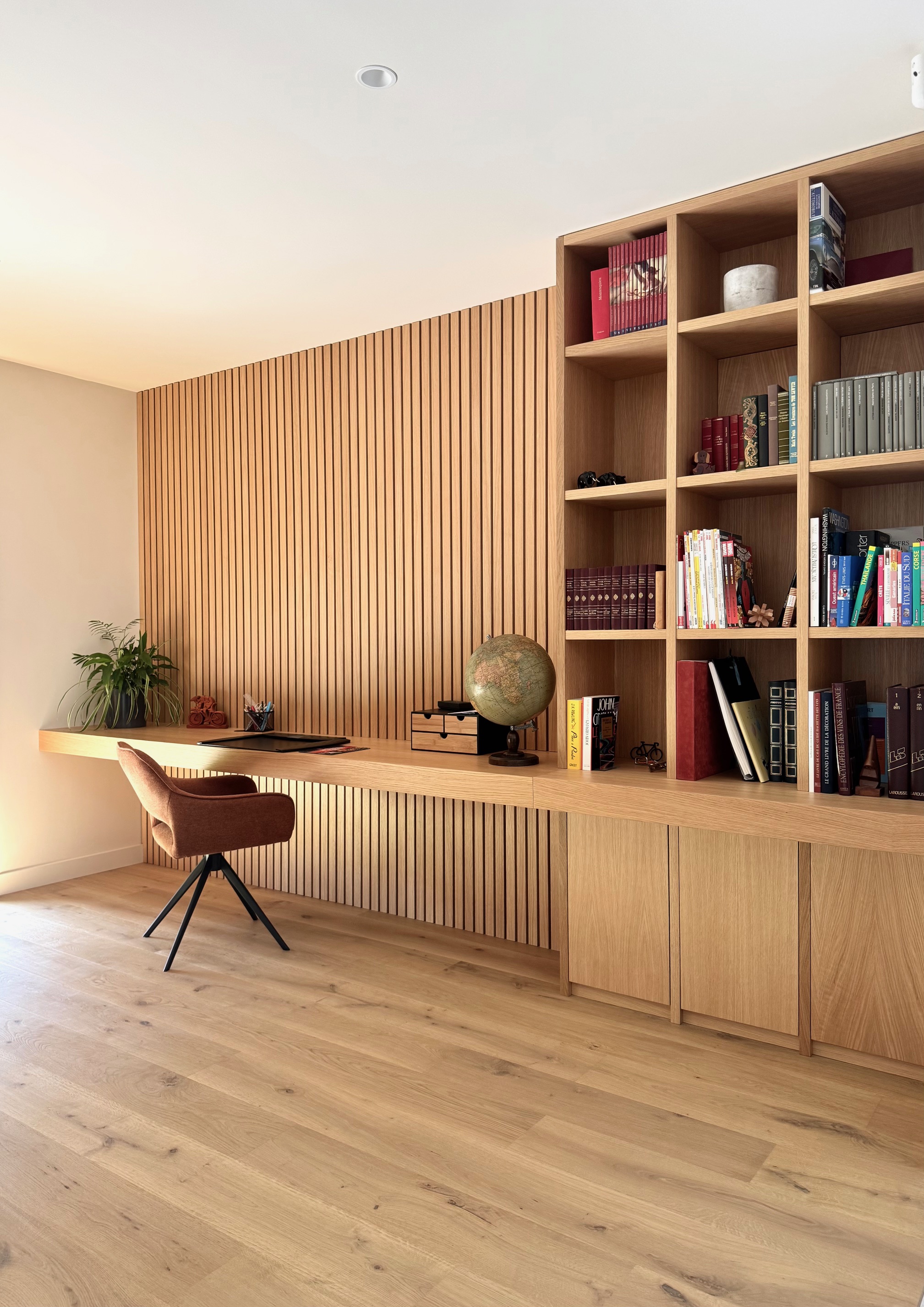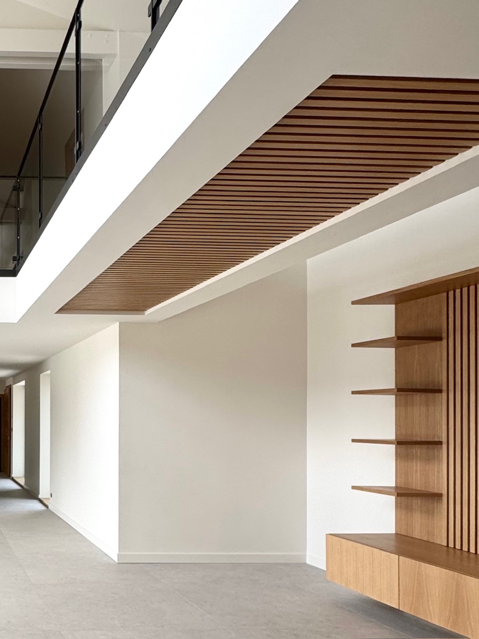 La pierre, le chêne et le marbre apportent cohérence et unité au projet, définissant les espaces avec sobriété, tandis que la lumière naturelle dialogue avec les matières et accompagne les parcours.